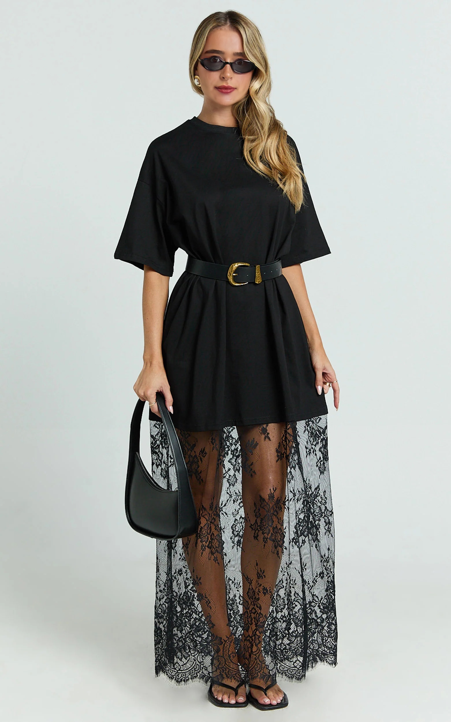 Home / Midi Dresses / Black Longline Lace Insert Midi Dress Tee