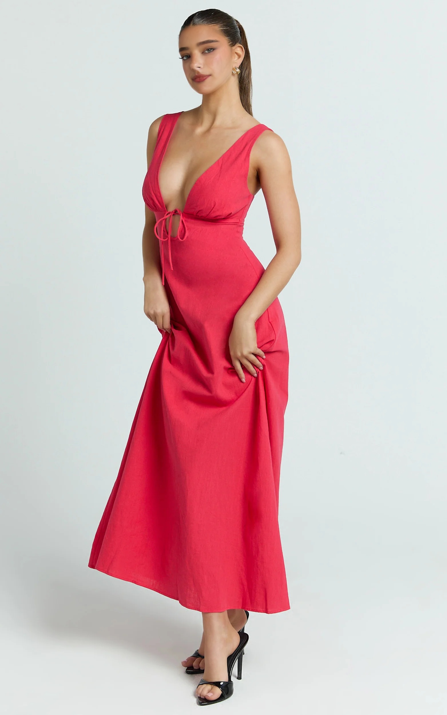Home / Midi Dresses / Red Plunge Neckline Tie Front A Line Midi Dress