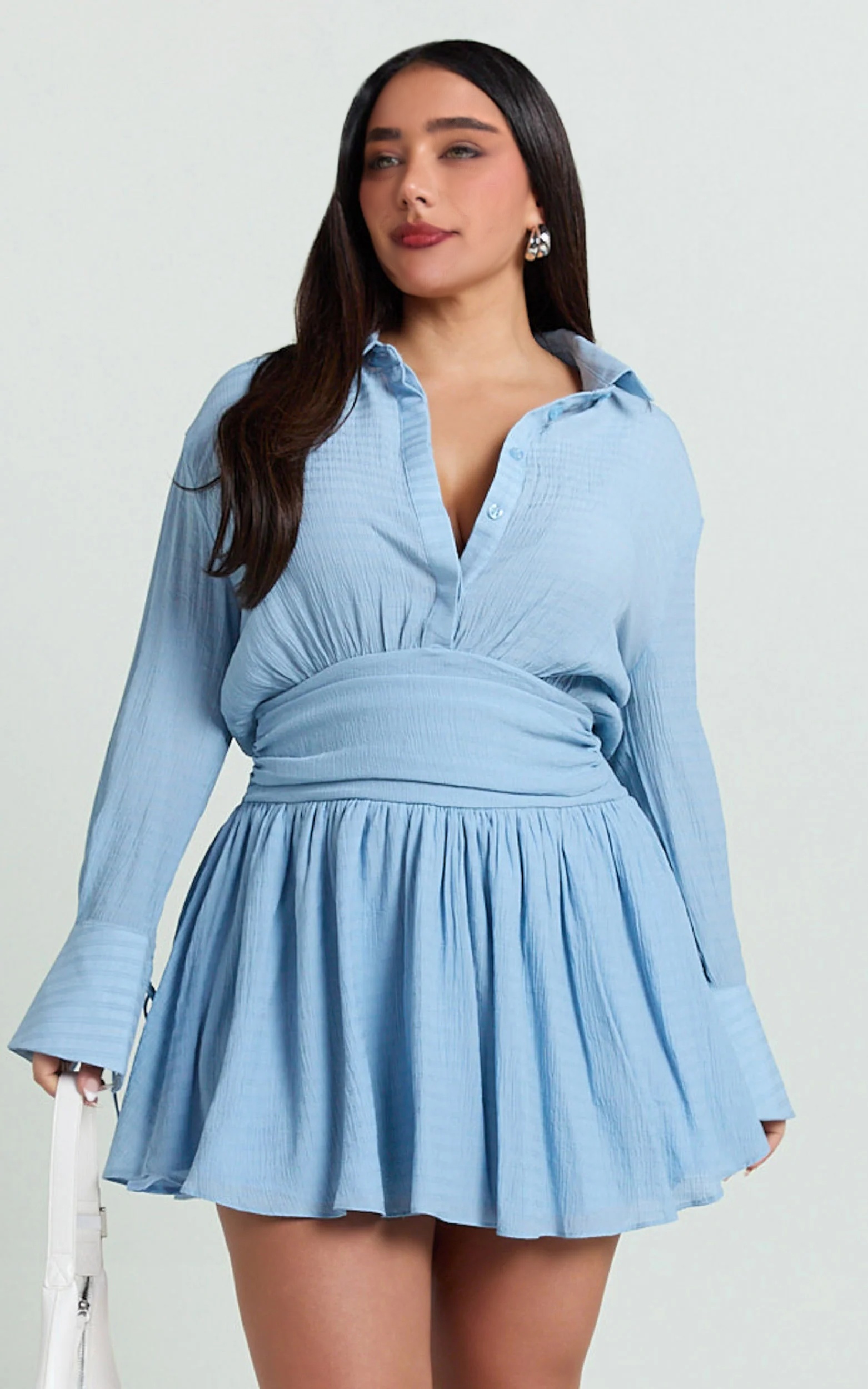 • Pale Blue Collared Long Sleeve Corset Waist Mini Shirt Dress