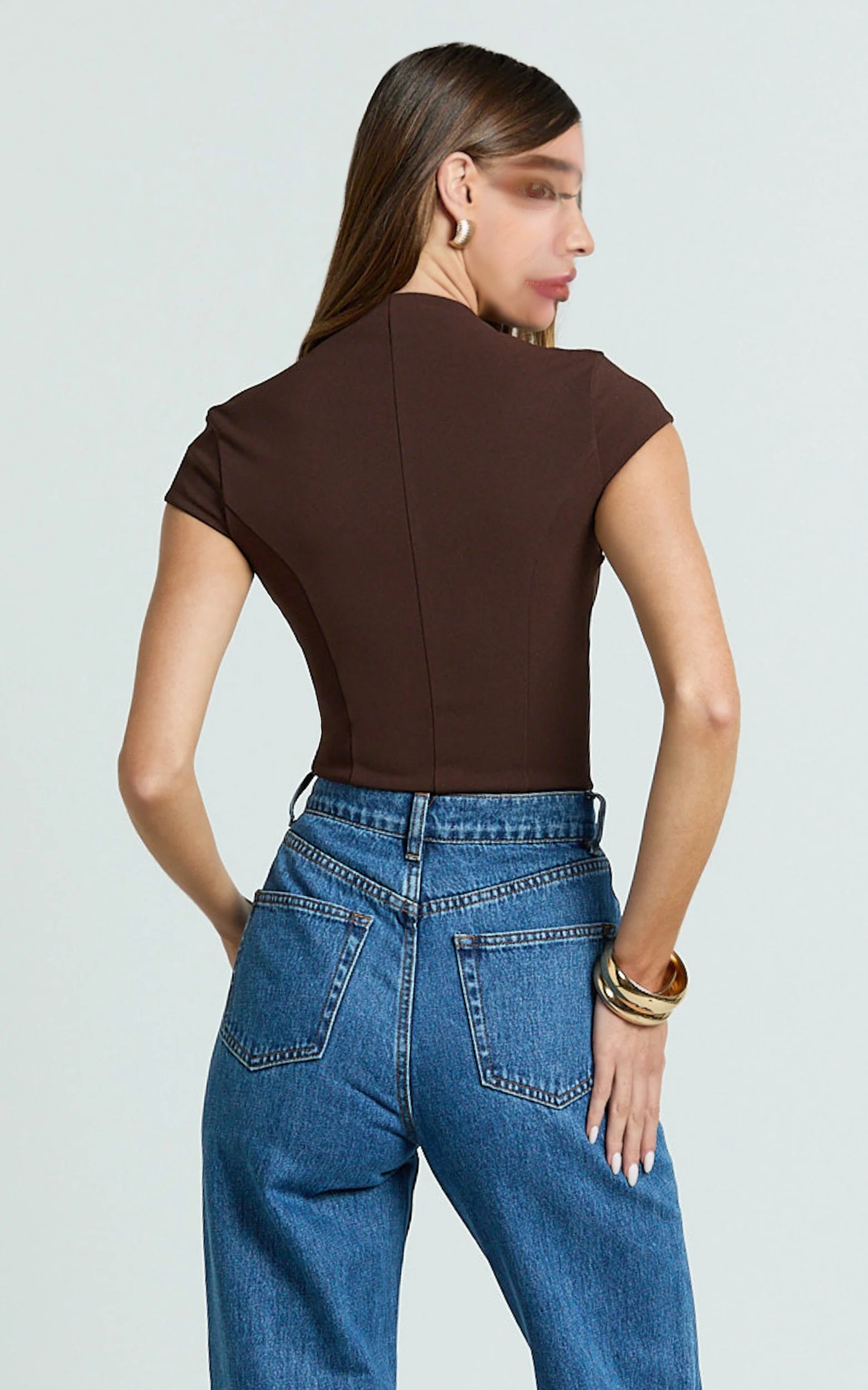 Cap Sleeve Slit Neck Zip Front Chocolate Top