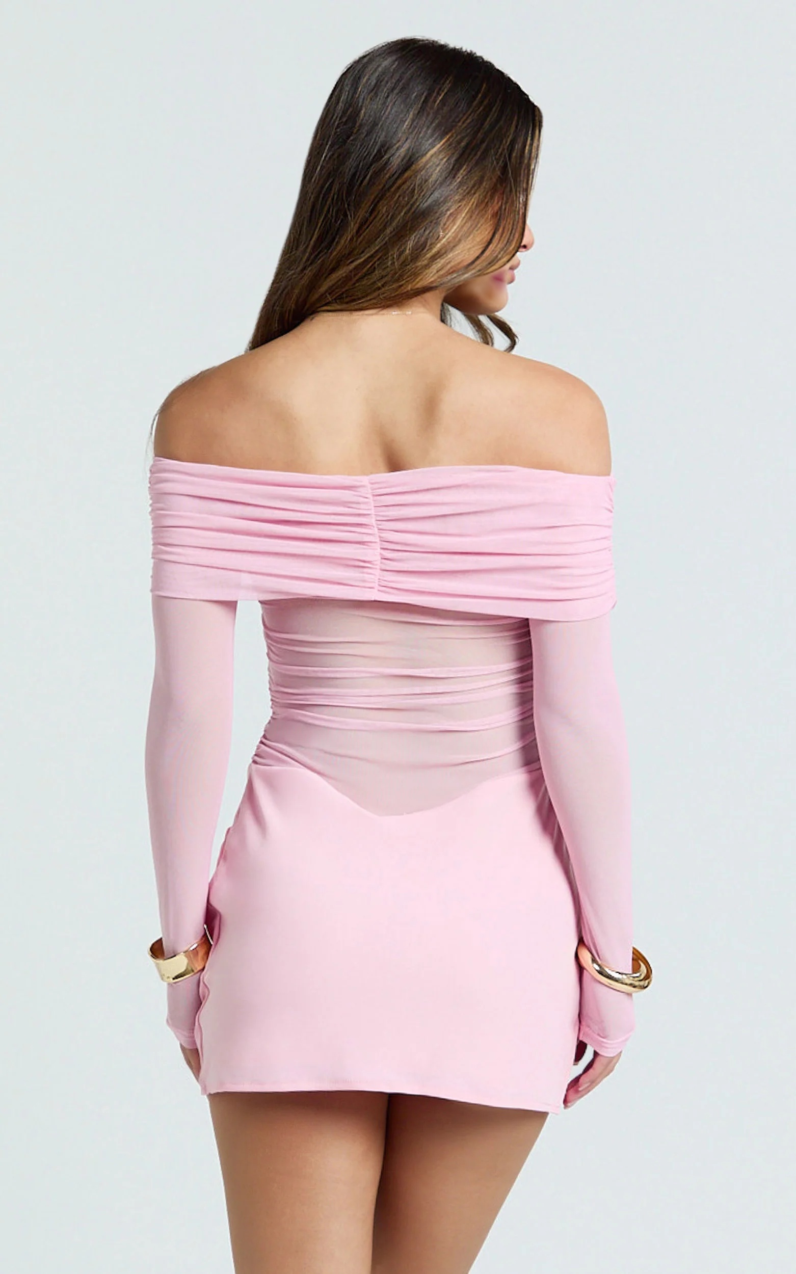 • Pink Long Sleeve Off-Shoulder Draped Bias Cut Mini Dress