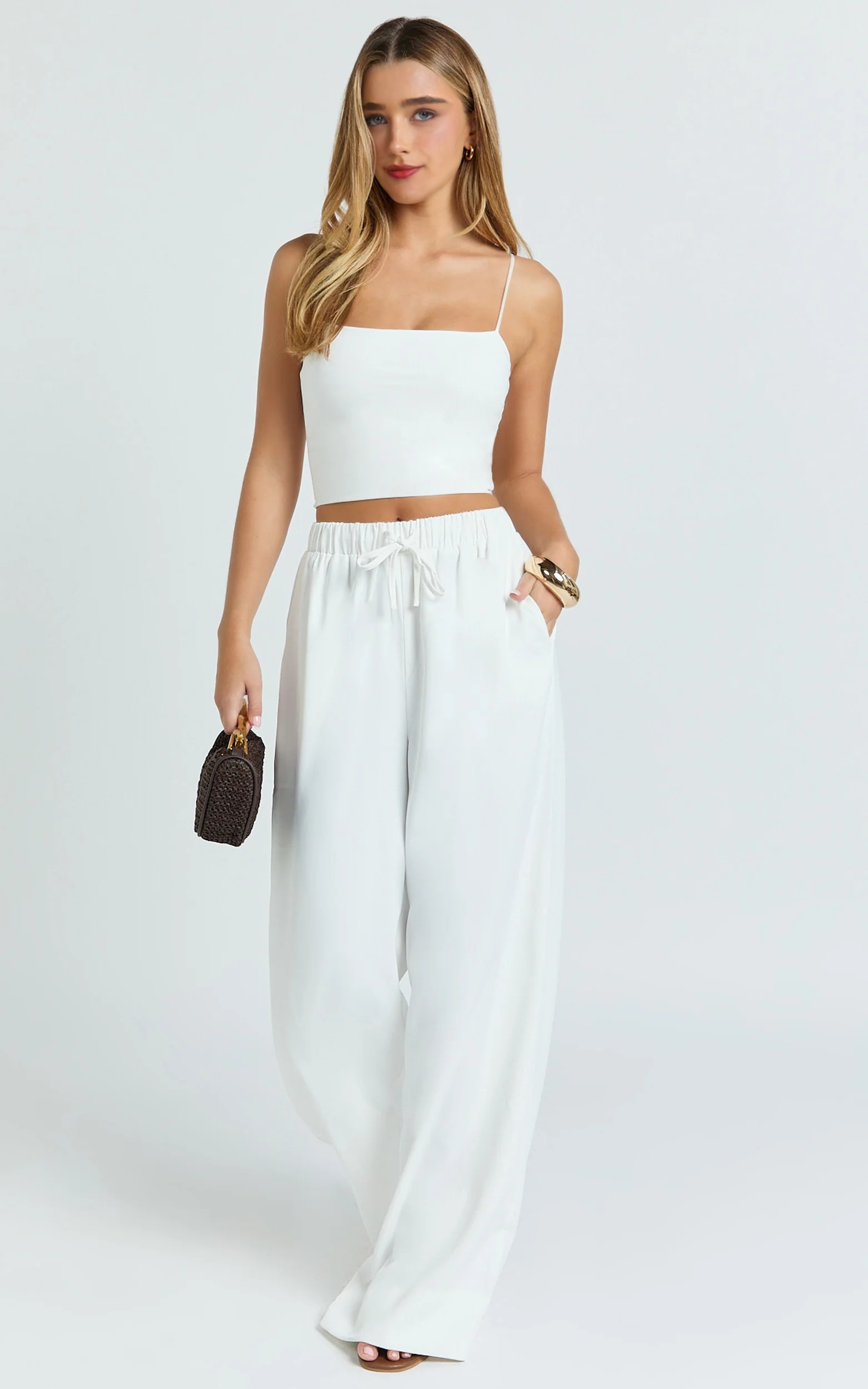 Nicole Pants - High Waist Elasticated Gathered Waist Wide Leg Pants in White