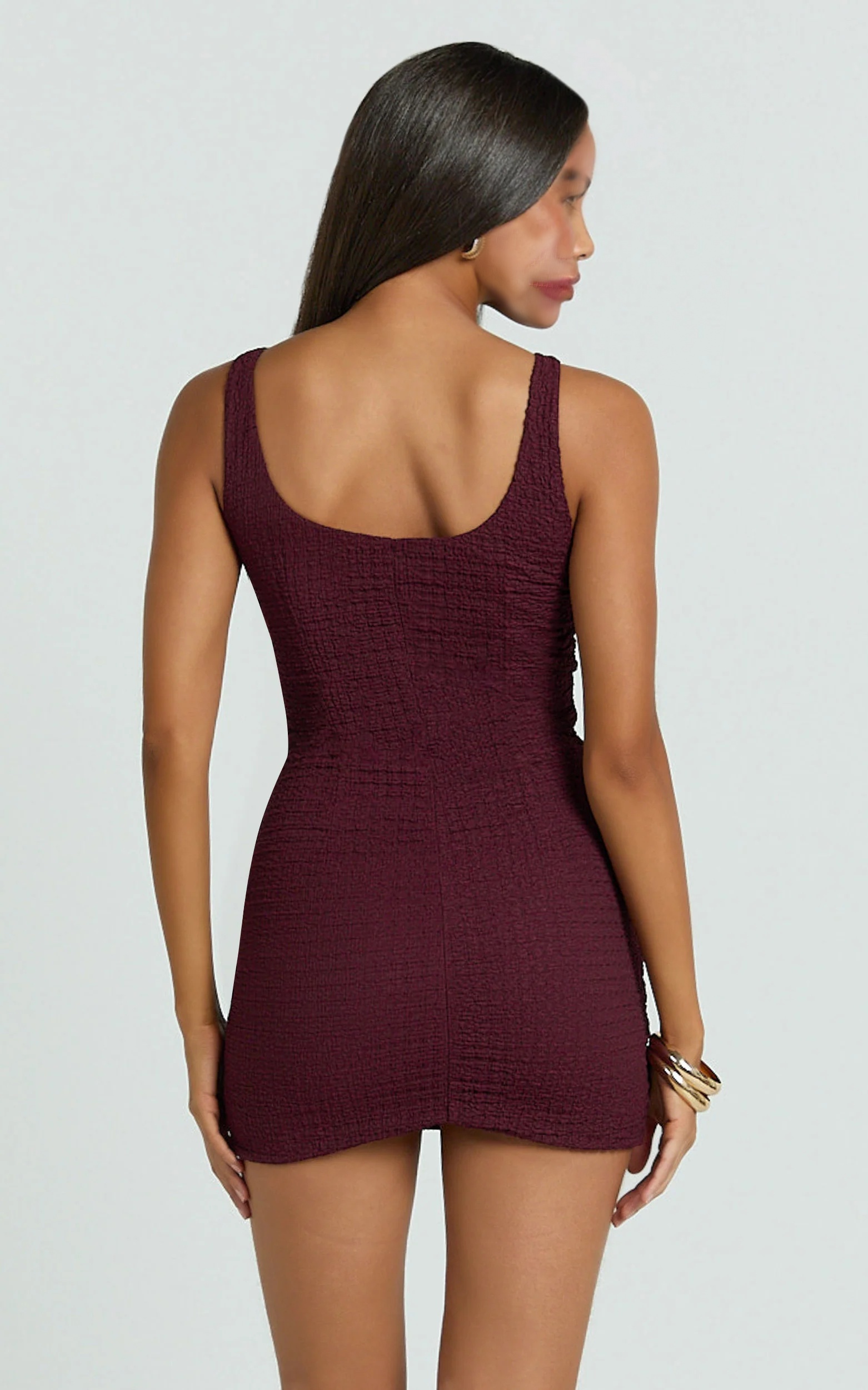 Wyatt Mini Dress - High Boatneck Twist Band Skirt Fitted Dress in Wine
