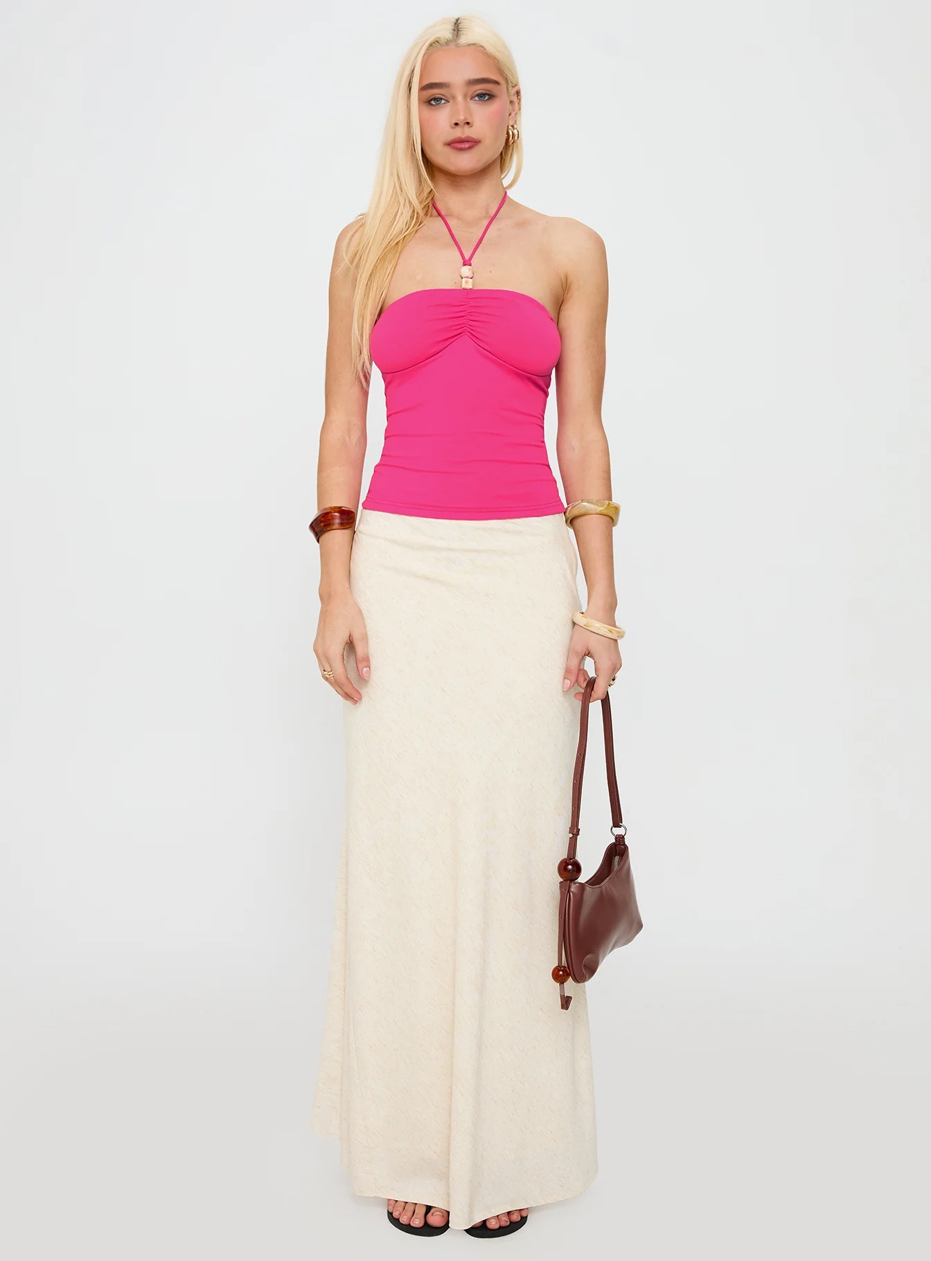 - Pinched bust design, slim fit, adjustable halter straps, and low back style